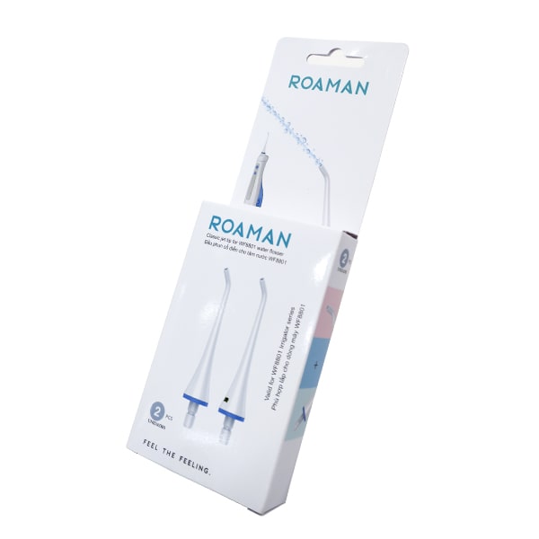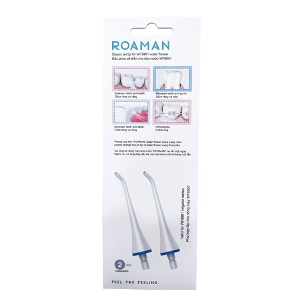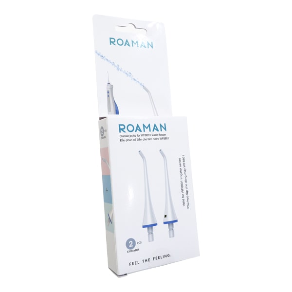 Bộ đầu phun cổ điển cho máy tăm nước ROAMAN WF8801 gồm 2 đầu tăm nước, được thiết kế dùng để di chuyển dòng nước với áp lực lớn vào kẽ răng và nướu giúp loại bỏ các mảng bám, vi khuẩn, thức ăn thừa mà bàn chải thông thường không thể làm sạch được. Sản phẩm được xem là một người bạn lý tưởng dành cho người đang niềng răng, trồng răng hay các bệnh về răng miệng…